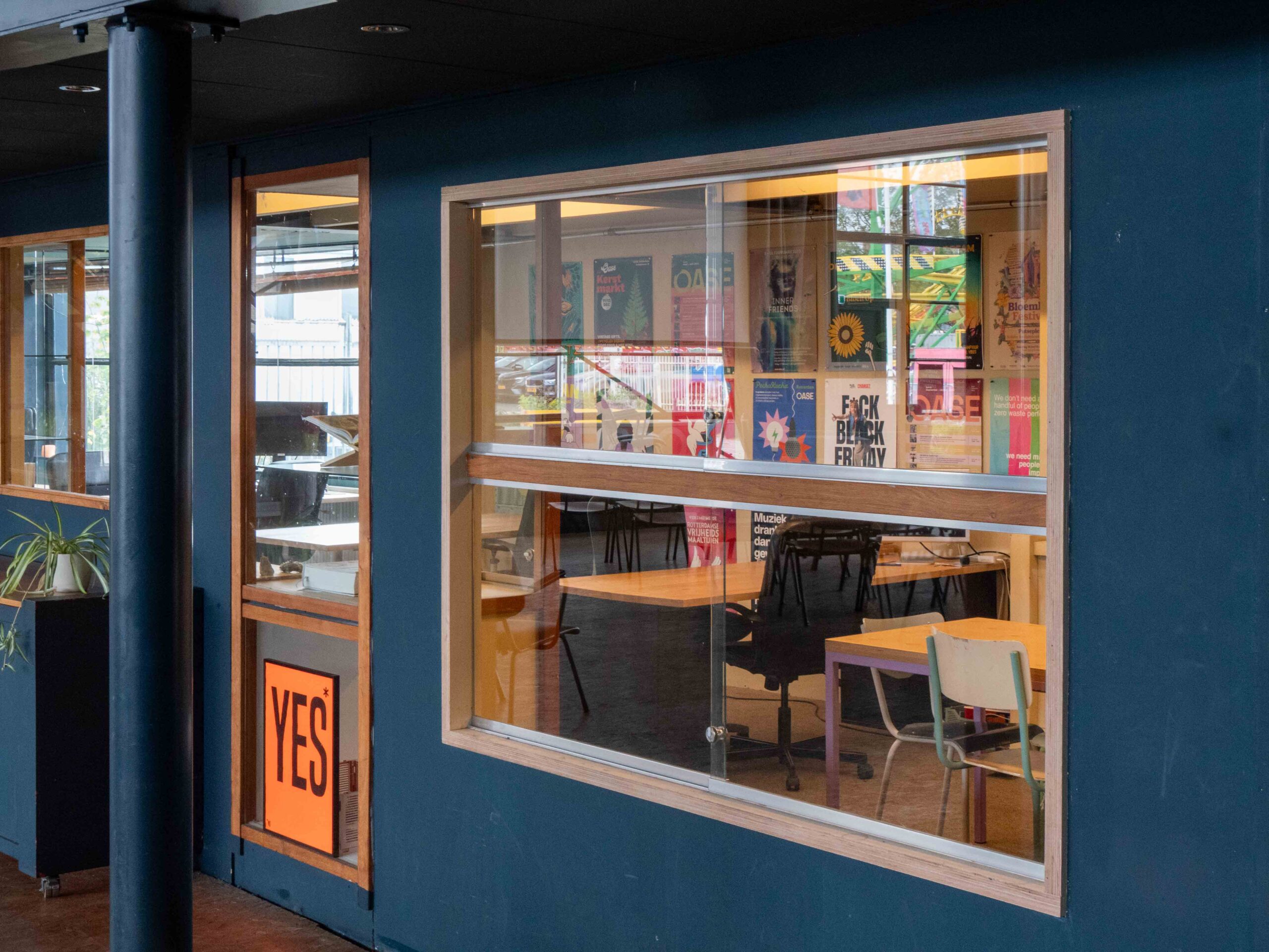 Het kantoor op de begane grond werd als eerste onder handen genomen. Met een open plan, nieuwe ramen gemaakt uit vitrinekasten en werkverlichting.