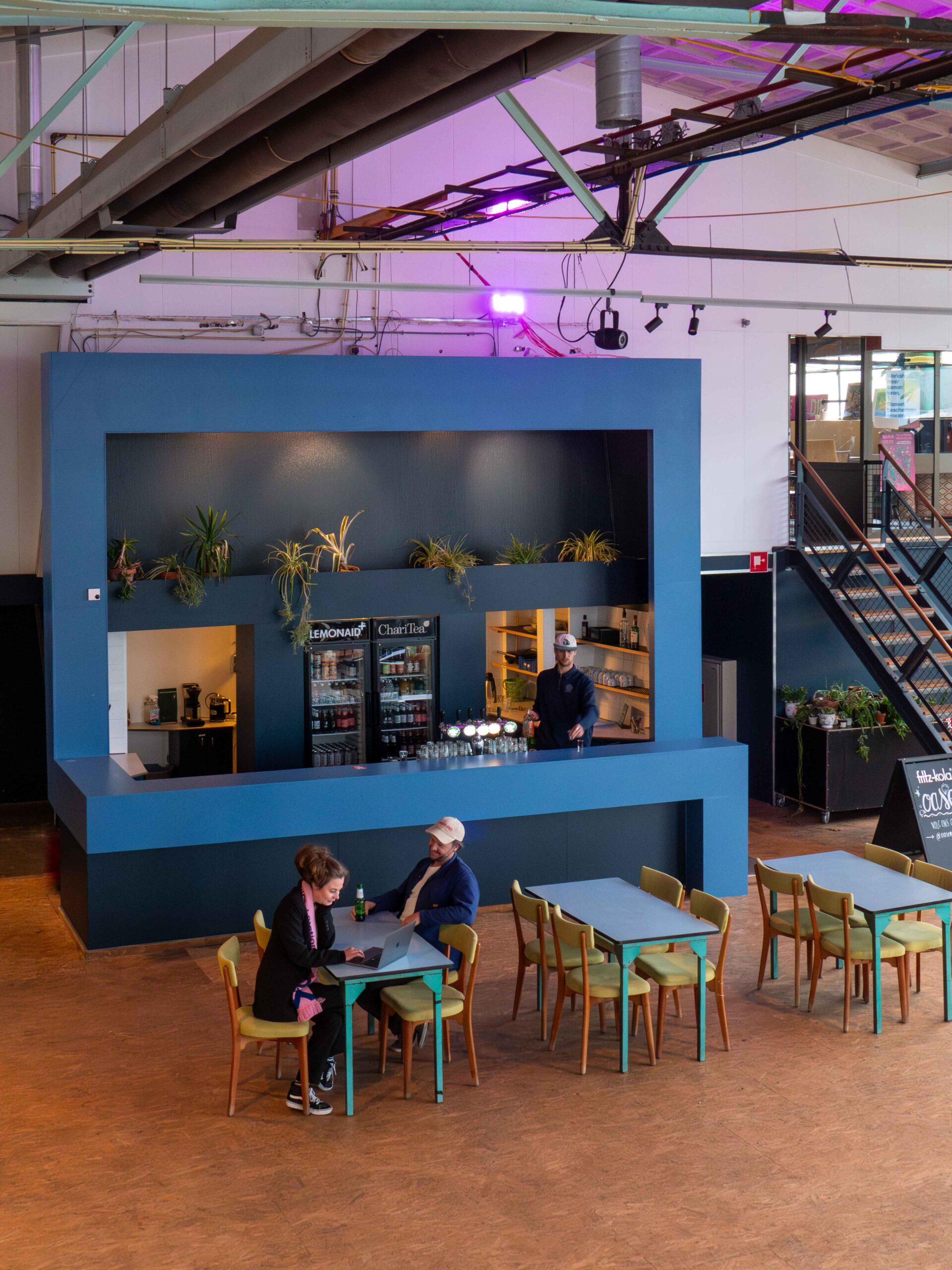 De blauwe bar in de grote zaal was ooit mini barretje, maar misstaat nu allerminst met een krachtige vorm gebouwd uit resthout.