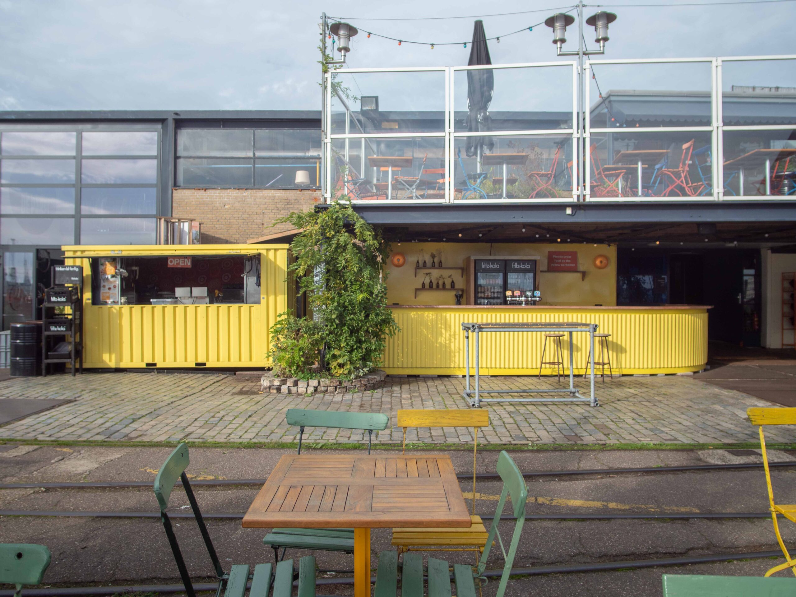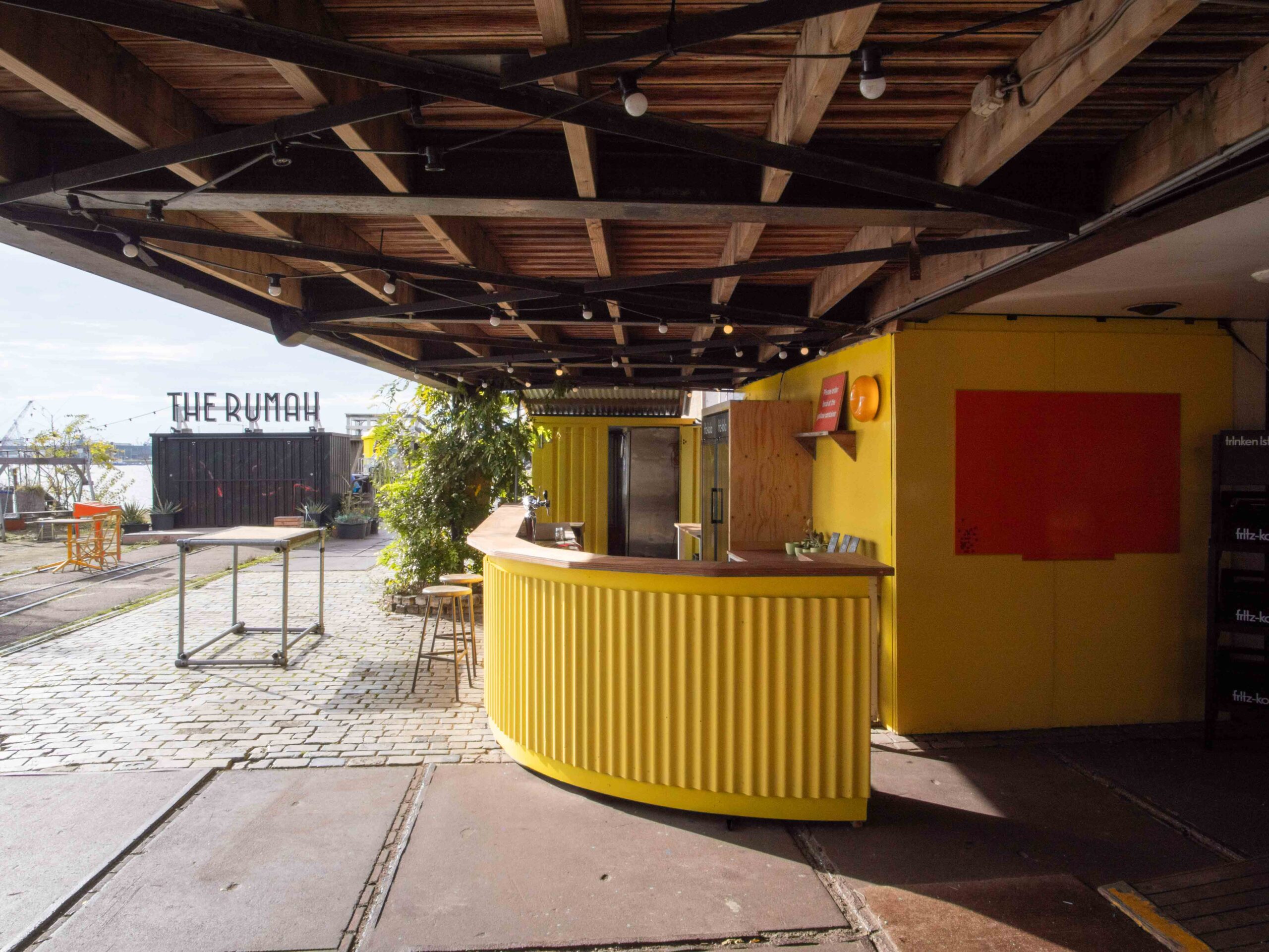 Vervelgens hebben we de gele strandbar gebouwd op de kade. 100% circulair met een golfplaten front gemaakt van een oude schuifpoort en een barblad uit archiefkasten.