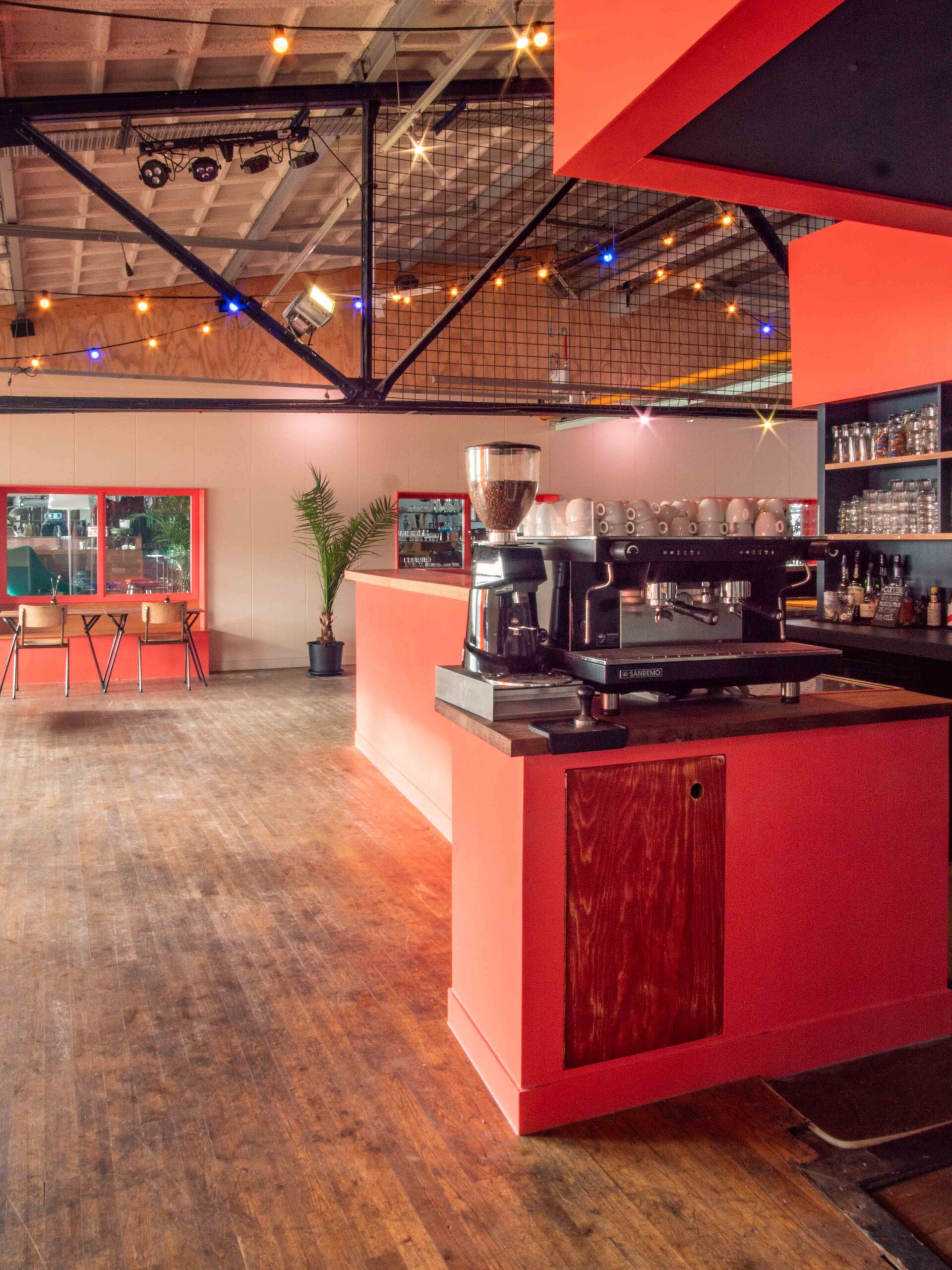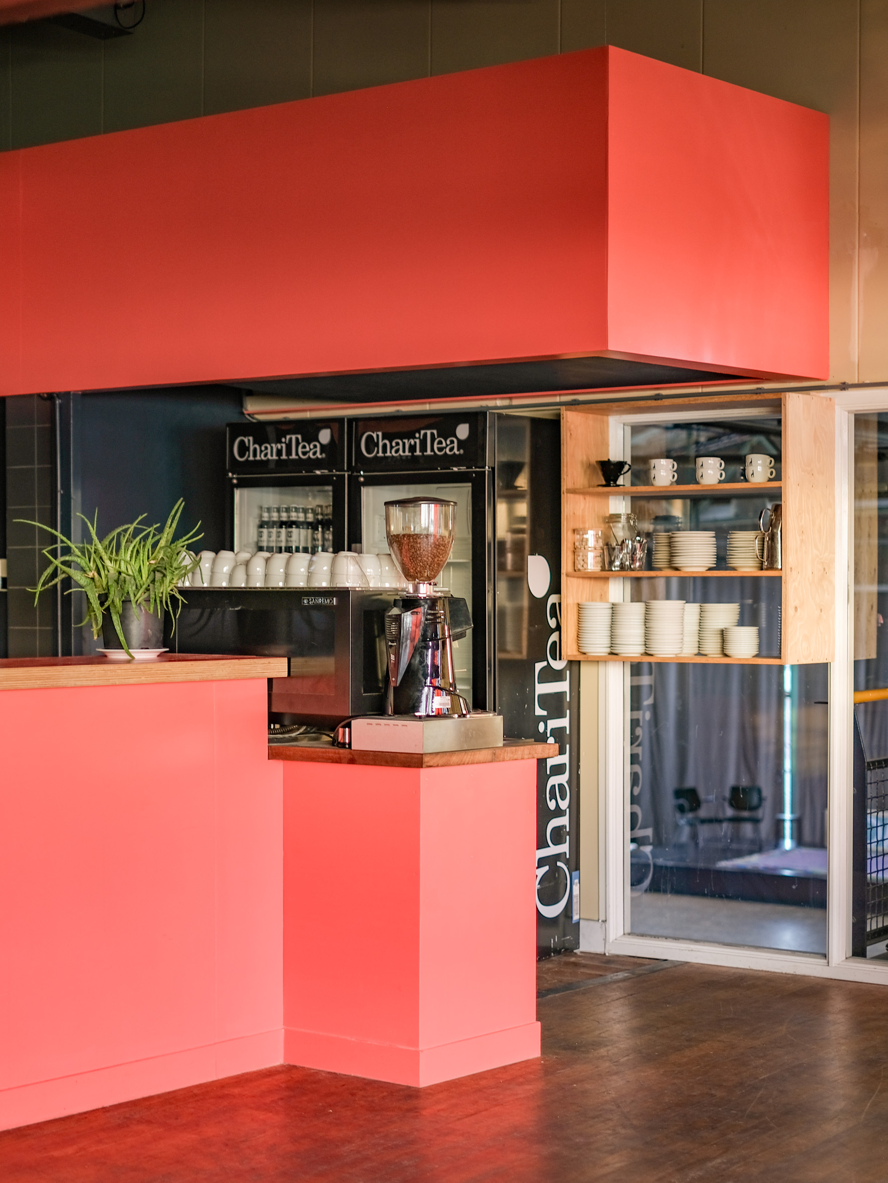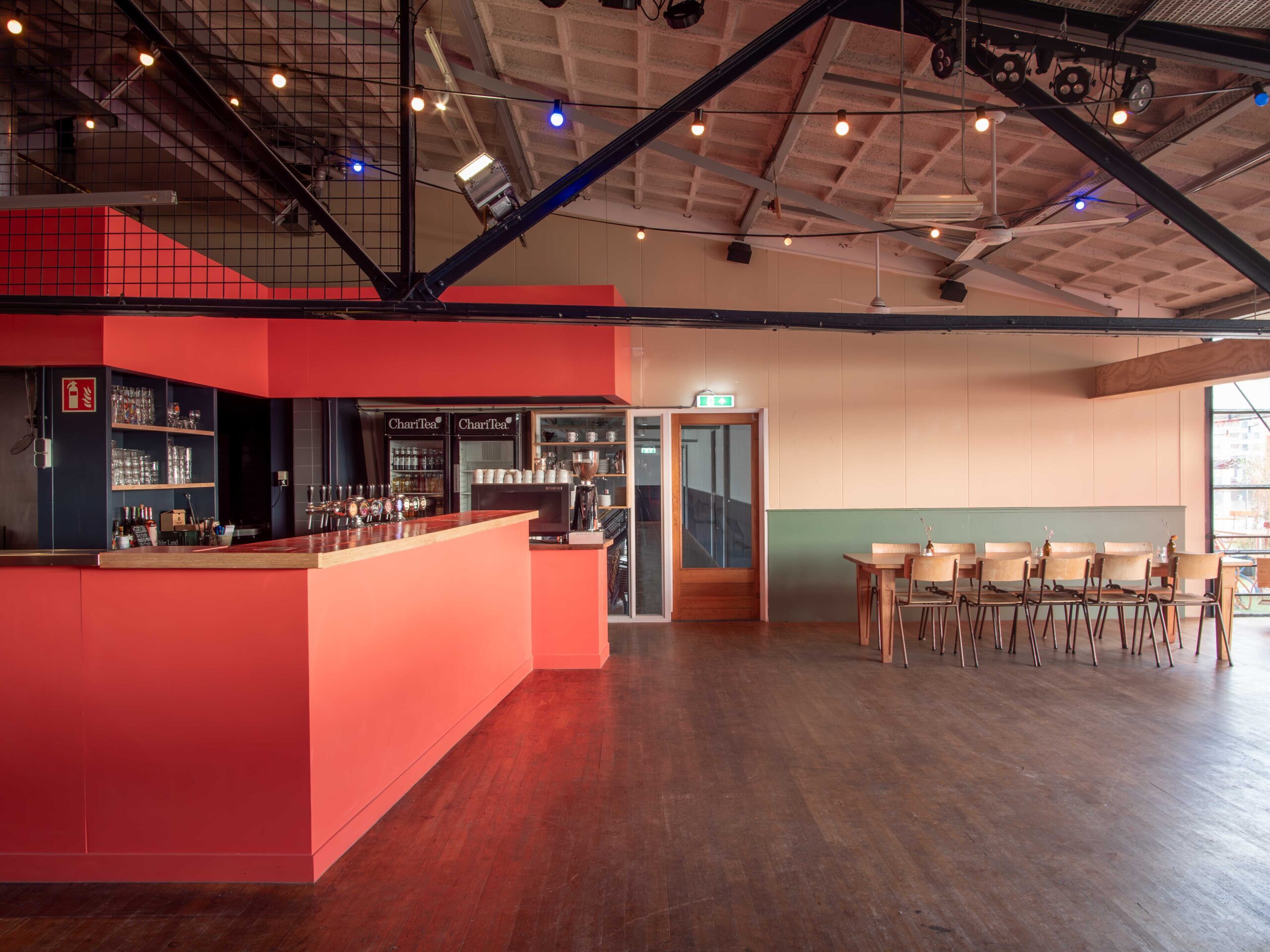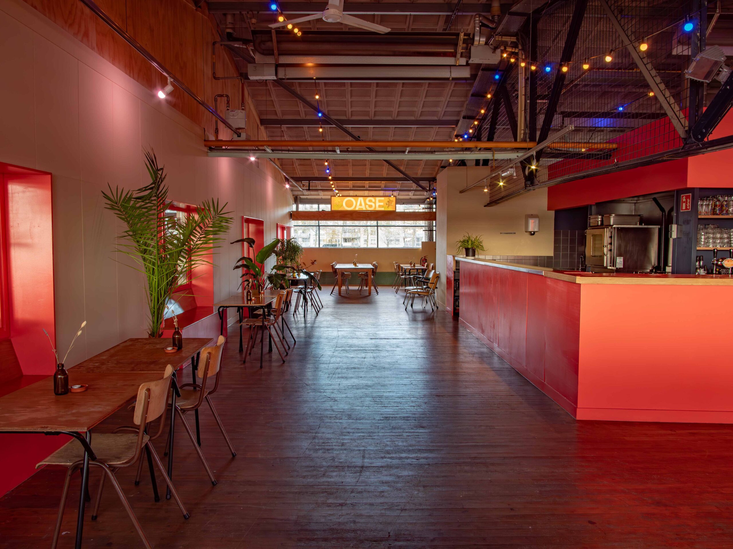 Momenteel zijn we bezig om het restaurant op de bovenverdieping nieuw leven in te blazen met een in het oog springende roze bar gemaakt. Deze werd gebouwd uit plaatmateriaal van Stedelijk Schiedam met details afkomstig uit en rondom Oase zelf.