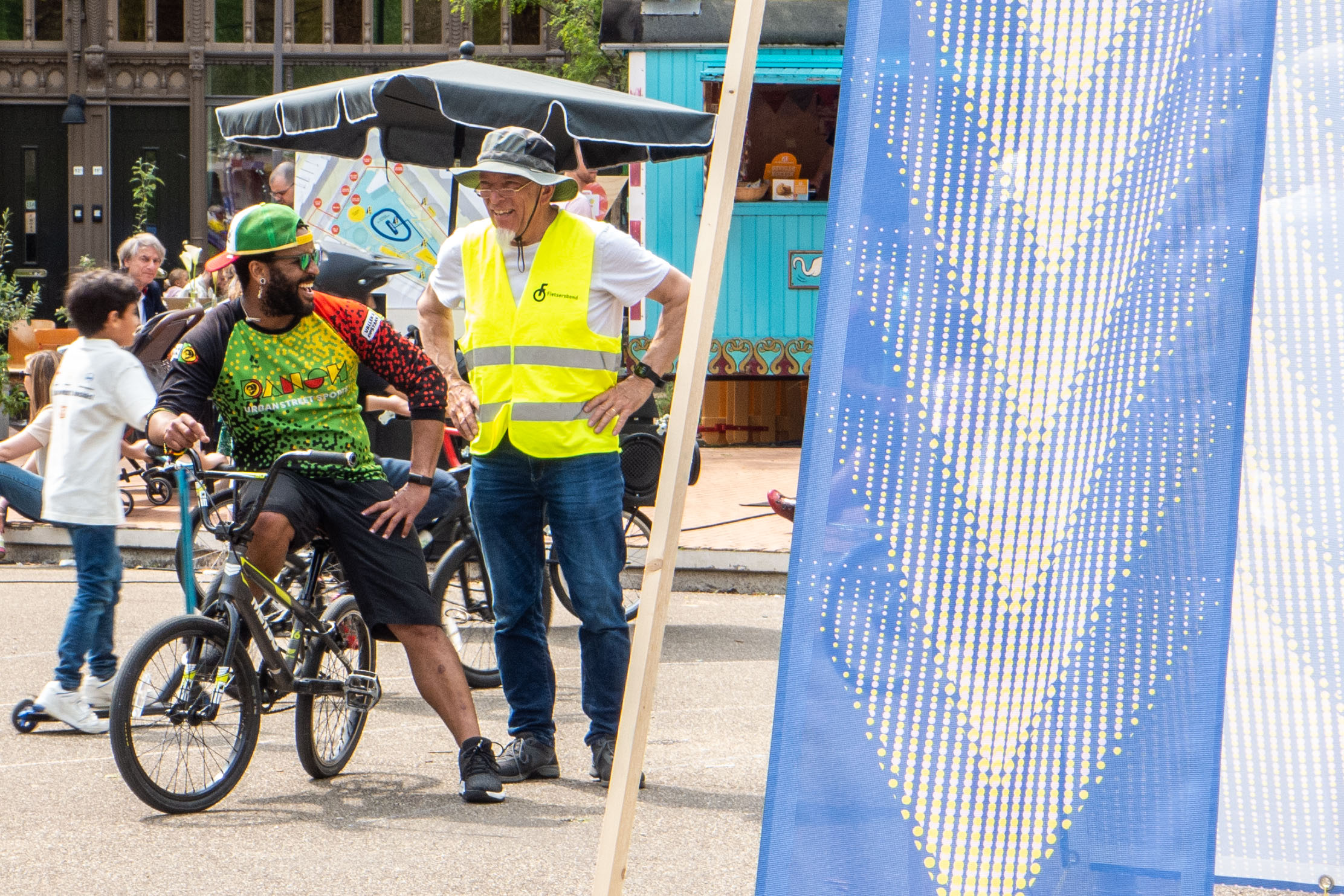 Rotterdam Rides festival stelt de vraag: hoe ziet de stad er uit als we allemaal zouden gaan fietsen? Om dit beeld te illustreren kwam een breed fietsgericht programma samen op het Deliplein. Om structuur gaven aan de vrolijke chaos van deze mooie dag verzorgden wij een indeling met verschillende routes over het plein. Voor de blauwe en gele route maakten we banners die als herkenningspunten op het plein dienden.